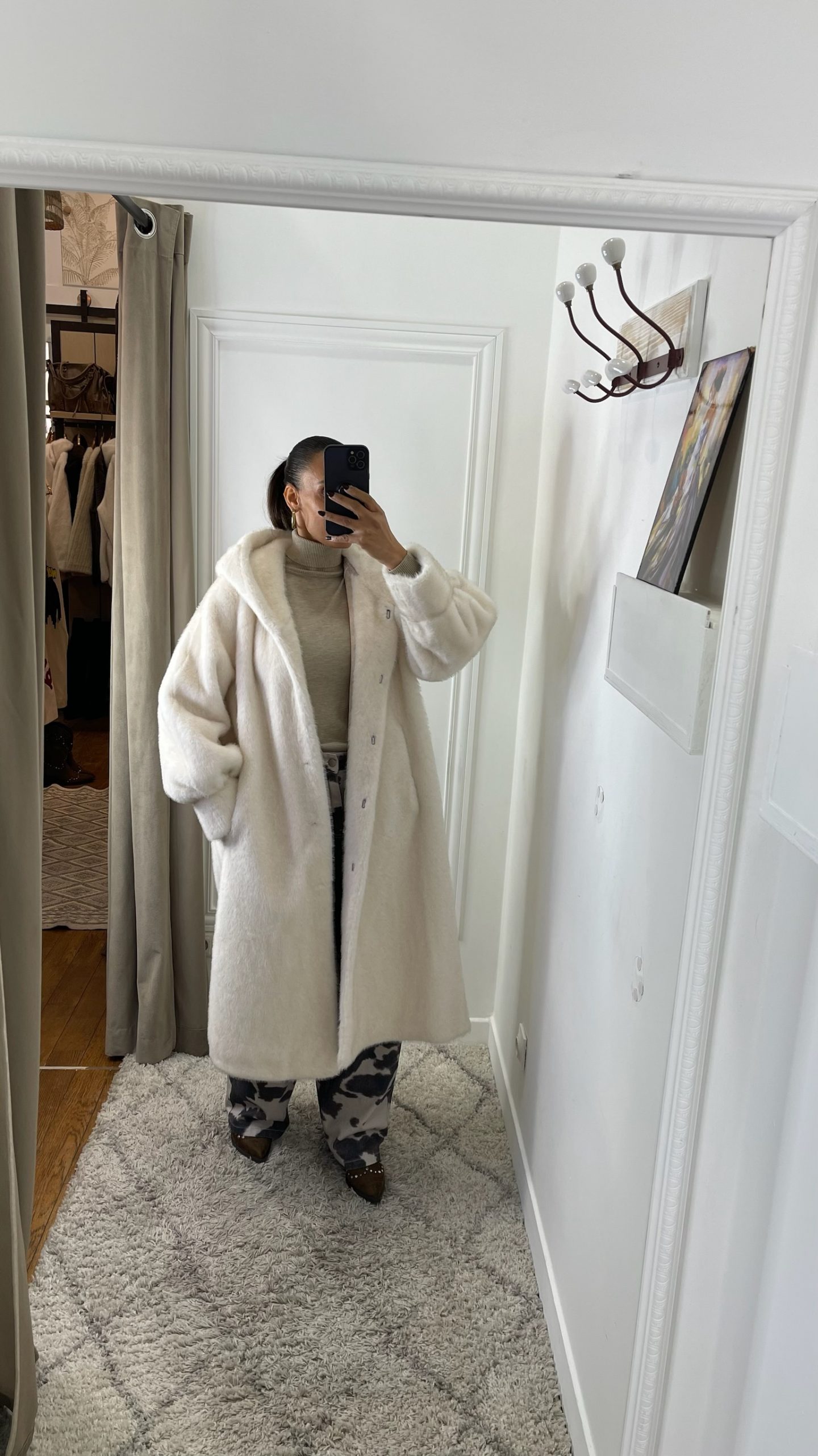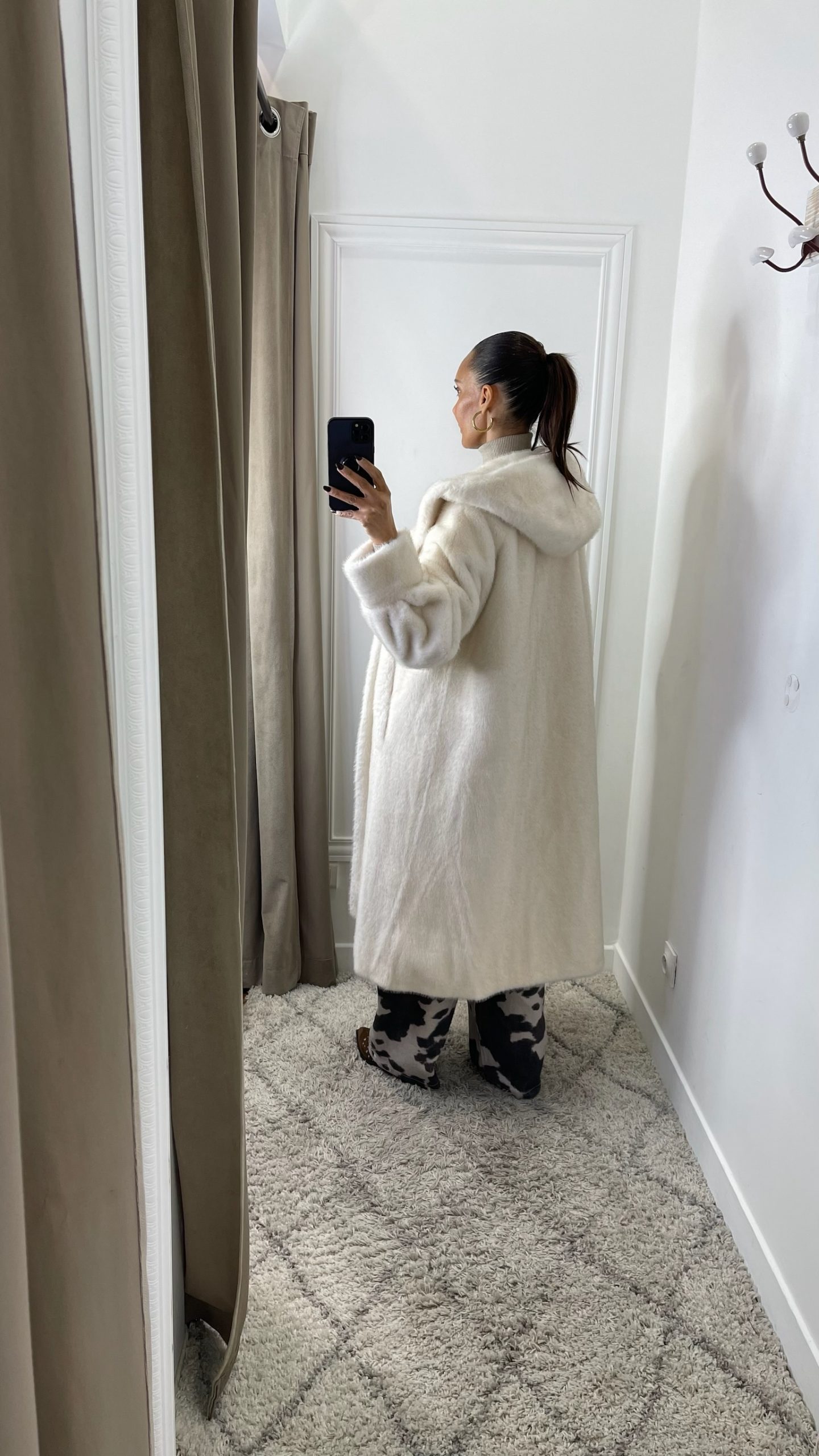 Fausse fourrure longue blanche à capucheFausse fourrure longue blanche à capuche