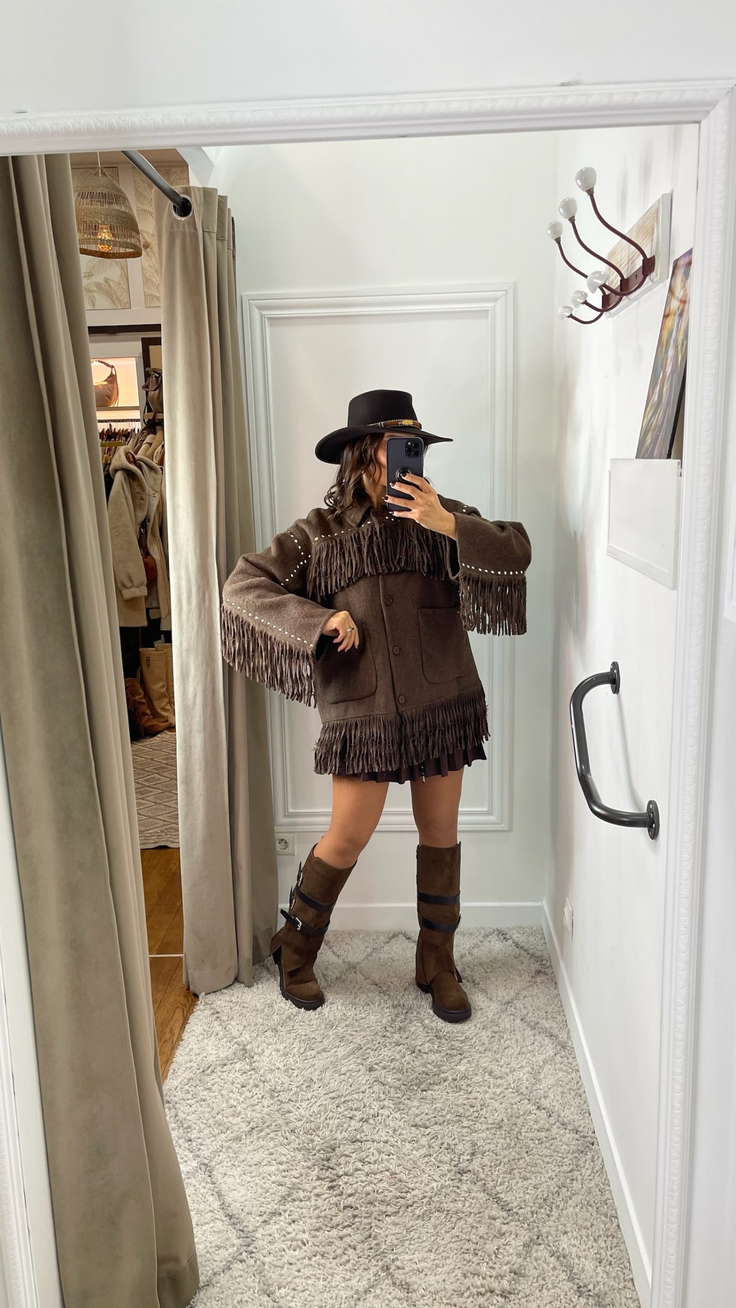 Veste 100% laine tendance au style western chic, ornée de frange et de clous décoratifs.